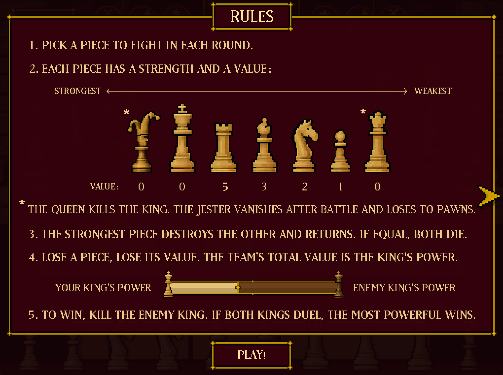 *The Queen, even though it has the weakest strength, it can destroy the enemy King. The Jester loses to Pawns and can only be used once in the game.
