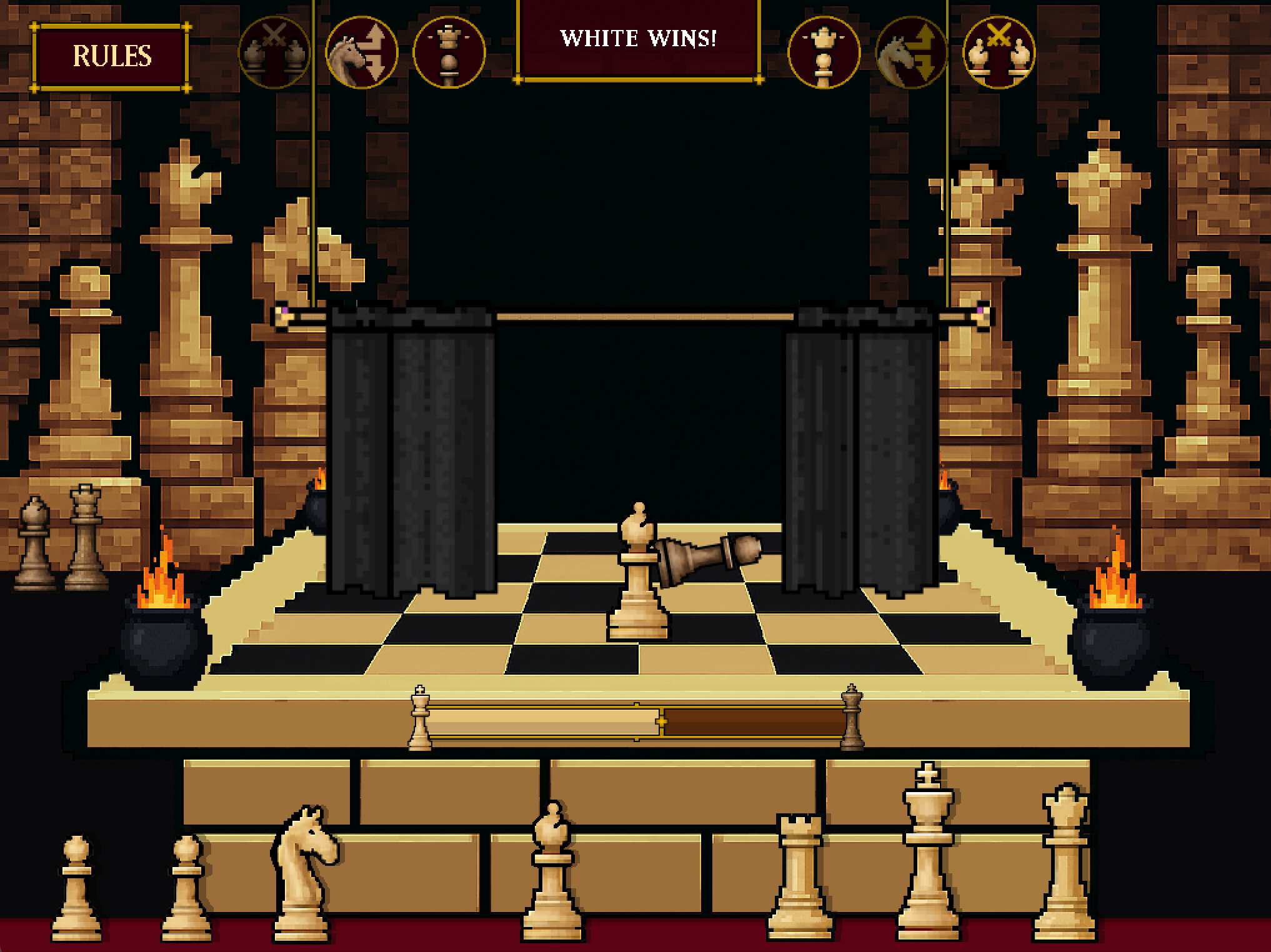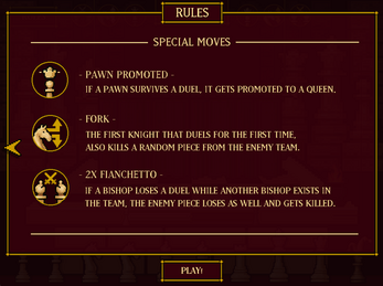 Bishop ("2X Fianchetto"): If a Bishop loses a duel while another Bishop exists in the same team, the enemy piece loses as well and gets killed.