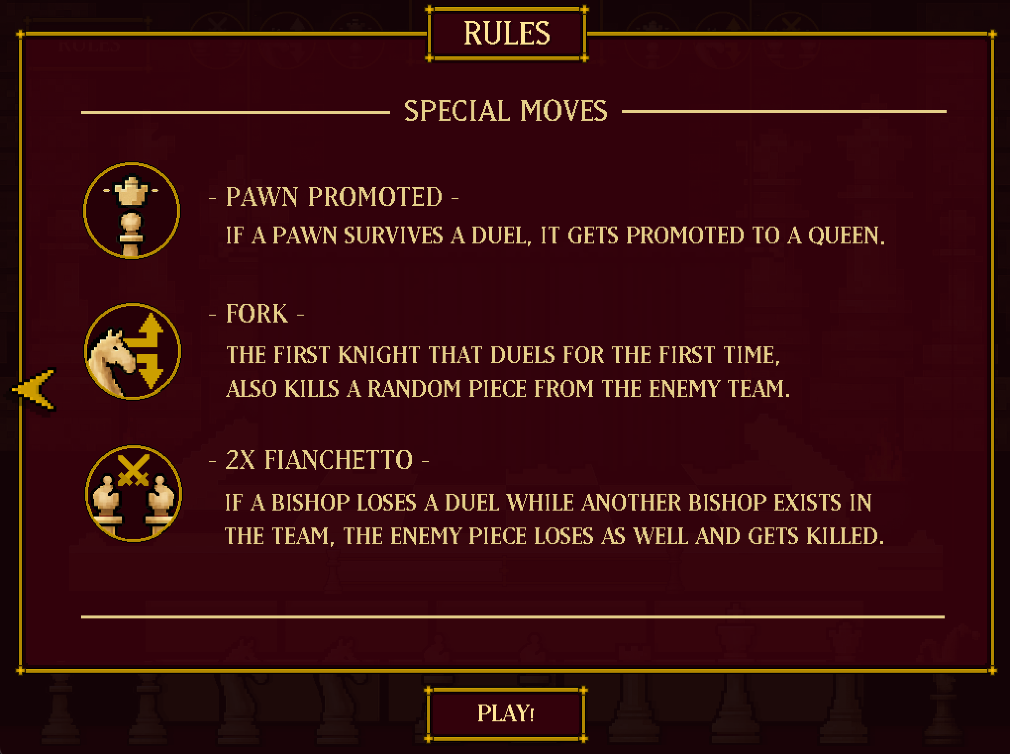 Knight ("Fork"): The first Knight that duels for the first time. also kills a random piece from the opponent's team.