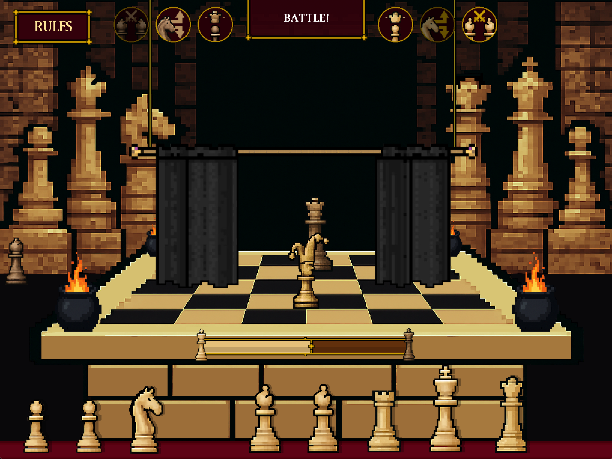 The two sides are selecting a chess piece each, putting them behind a black curtain, waiting for the duel to start when the timer stops. As the curtain unfolds, the two pieces picked are revealed and the duel starts. The duels will happen again and again until one of the Kings is destroyed. If you do not select a piece, one will be selected in random to duel.